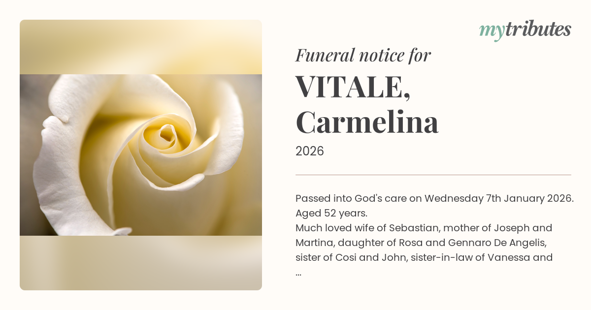 18°CPassed into God's care on Wednesday 7th January 2026. Aged 52 years. Much loved wife of Sebastian, mother of Joseph and Martina, daughter of Rosa and Gennaro De Angelis, sister of Cosi and John, sister-in-law of Vanessa and Stacey, aunty of Olivia, Sophie, Xavier, Zak and Magnus. Love by all family members and many friends. Funeral Mass for Carmelina will be held at All Saints Catholic Church, 4 Faheys Rd E, Albany Creek, on Saturday 17th January, at 10.30 a.m., followed by interment at Albany Creek Memorial Park Cemetery, Bridgeman Downs. Rosary will be recited from 10 a.m. Flower arrangements are welcome as Carmelina loved flowers. Charity donations links and Livestreaming will be available on the Legacy Funerals Tribute Page.