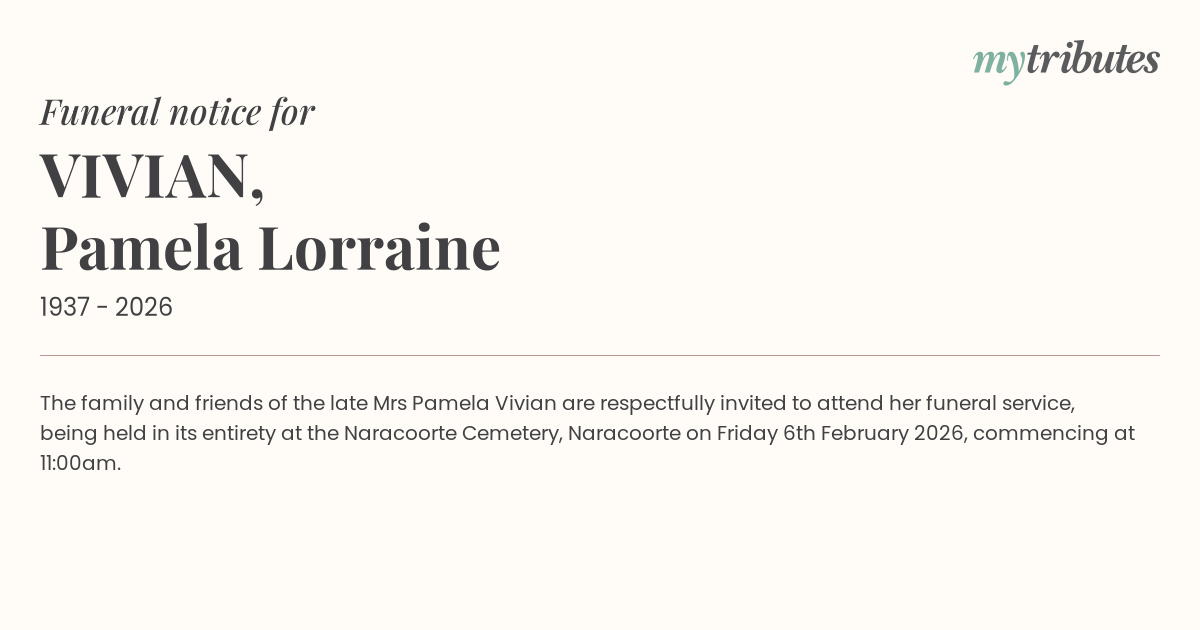 18°CThe family and friends of the late Mrs Pamela Vivian are respectfully invited to attend her funeral service, being held in its entirety at the Naracoorte Cemetery, Naracoorte on Friday 6th February 2026, commencing at 11:00am.