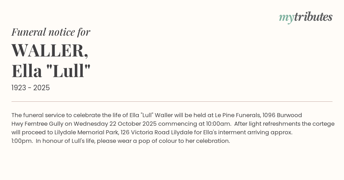 18°CThe funeral service to celebrate the life of Ella "Lull" Waller will be held at Le Pine Funerals, 1096 Burwood Hwy Ferntree Gully on Wednesday 22 October 2025 commencing at 10:00am. After light refreshments the cortege will proceed to Lilydale Memorial Park, 126 Victoria Road Lilydale for Ella's interment arriving approx. 1:00pm. In honour of Lull's life, please wear a pop of colour to her celebration.