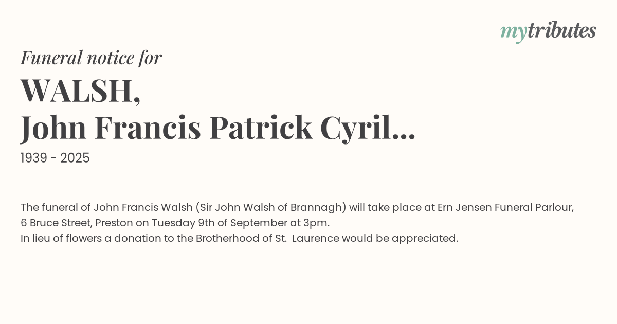 18°CThe funeral of John Francis Walsh (Sir John Walsh of Brannagh) will take place at Ern Jensen Funeral Parlour, 6 Bruce Street, Preston on Tuesday 9th of September at 3pm.