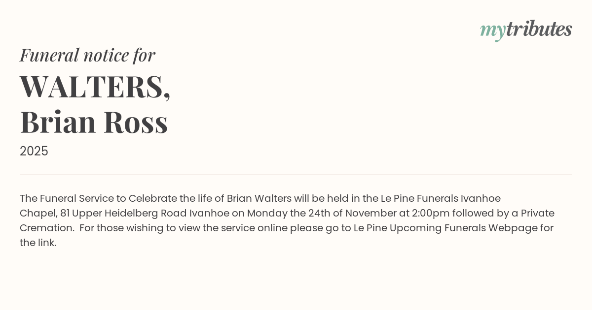 18°CThe Funeral Service to Celebrate the life of Brian Walters will be held in the Le Pine Funerals Ivanhoe Chapel, 81 Upper Heidelberg Road Ivanhoe on Monday the 24th of November at 2:00pm followed by a Private Cremation. For those wishing to view the service online please go to Le Pine Upcoming Funerals Webpage for the link.