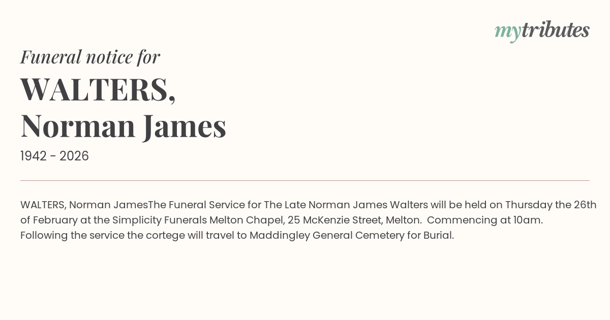 The Funeral Service for The Late Norman James Walters will be held on Thursday the 26th of February at the Simplicity Funerals Melton Chapel, 25 McKenzie Street, Melton.