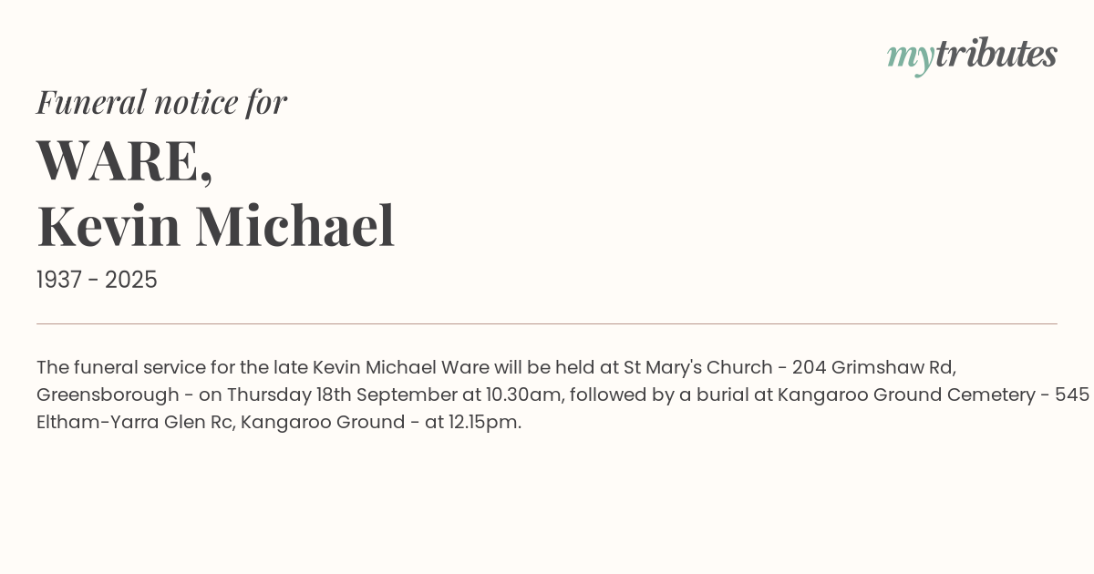 18°CThe funeral service for the late Kevin Michael Ware will be held at St Mary's Church - 204 Grimshaw Rd, Greensborough - on Thursday 18th September at 10.30am, followed by a burial at Kangaroo Ground Cemetery - 545 Eltham-Yarra Glen Rc, Kangaroo Ground - at 12.15pm.