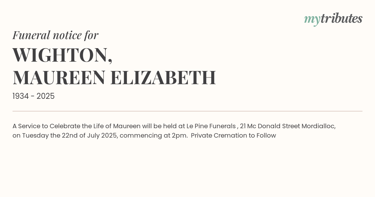 18°CA Service to Celebrate the Life of Maureen will be held at Le Pine Funerals , 21 Mc Donald Street Mordialloc, on Tuesday the 22nd of July 2025, commencing at 2pm. Private Cremation to Follow