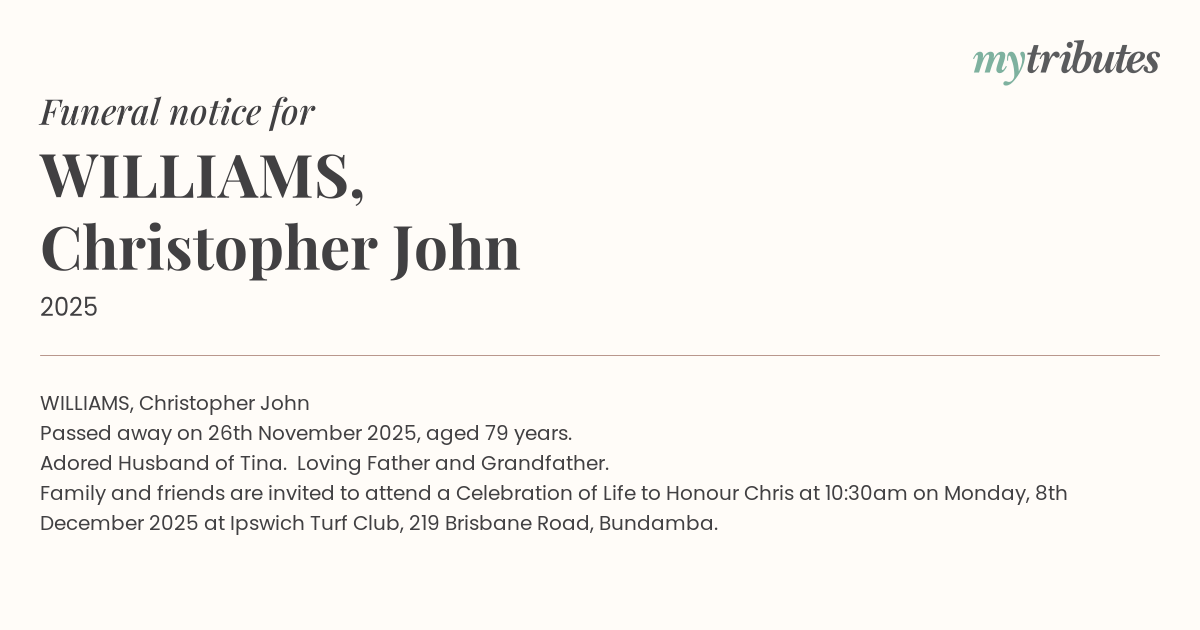 Family and friends are invited to attend a Celebration of Life to Honour Chris at 10:30am on Monday, 8th December 2025 at Ipswich Turf Club, 219 Brisbane Road, Bundamba.