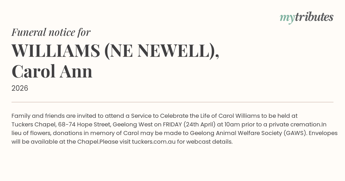 18°CFamily and friends are invited to attend a Service to Celebrate the Life of Carol Williams to be held at Tuckers Chapel, 68-74 Hope Street, Geelong West on FRIDAY (24th April) at 10am prior to a private cremation.