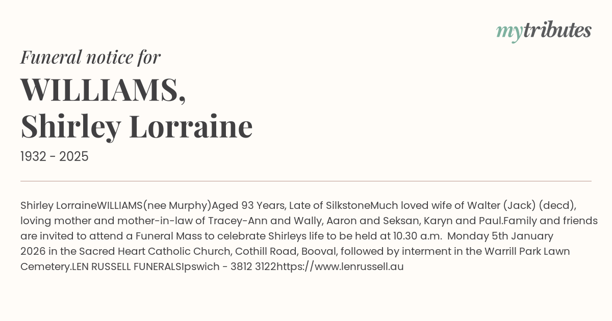 Family and friends are invited to attend a Funeral Mass to celebrate Shirley’s life to be held at 10.30 a.m. Monday 5th January 2026 in the Sacred Heart Catholic Church, Cothill Road, Booval, followed by interment in the Warrill Park Lawn Cemetery.
