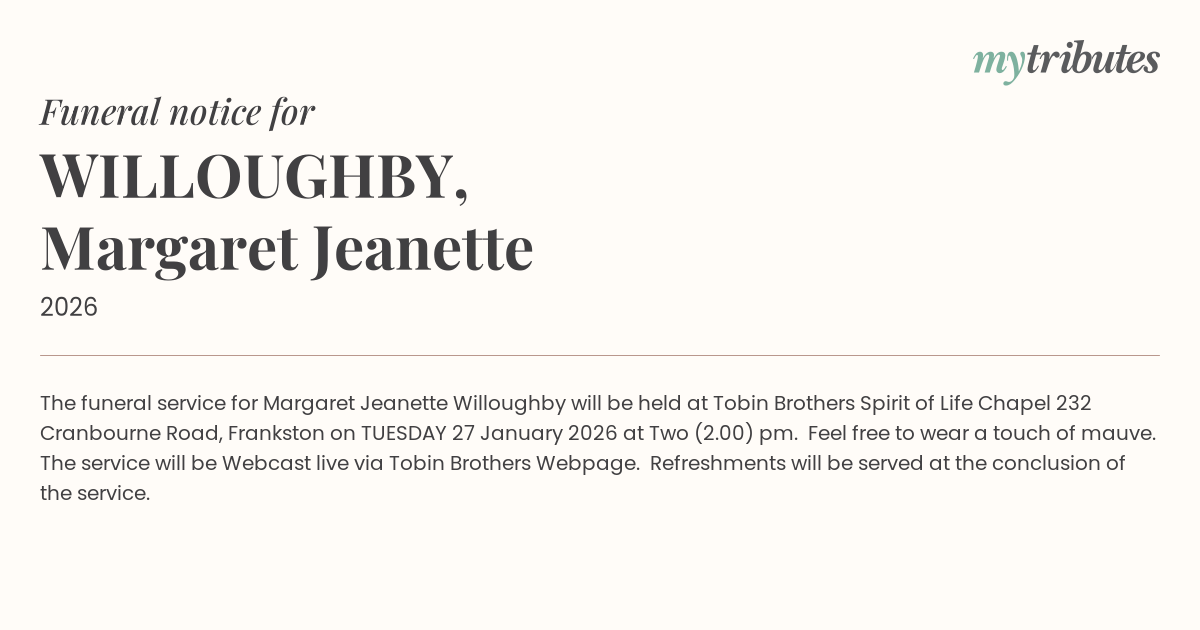 18°CThe funeral service for Margaret Jeanette Willoughby will be held at Tobin Brothers Spirit of Life Chapel 232 Cranbourne Road, Frankston on TUESDAY 27 January 2026 at Two (2.00) pm. Feel free to wear a touch of mauve. The service will be Webcast live via Tobin Brothers Webpage. Refreshments will be served at the conclusion of the service.