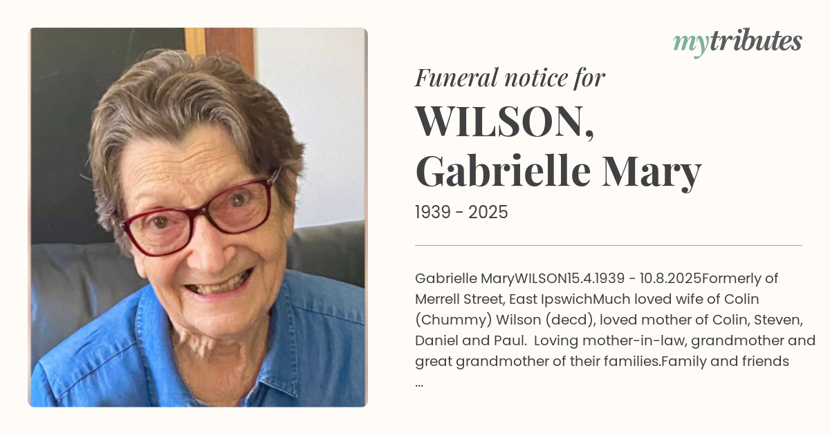 Family and friends are invited to attend a Funeral Mass to celebrate Gabrielle’s life to be held at 10.30 a.m. Monday 25th August 2025 in St. Mary’s Catholic Church, Elizabeth Street, Ipswich, followed by interment in the Warrill Park Lawn Cemetery.