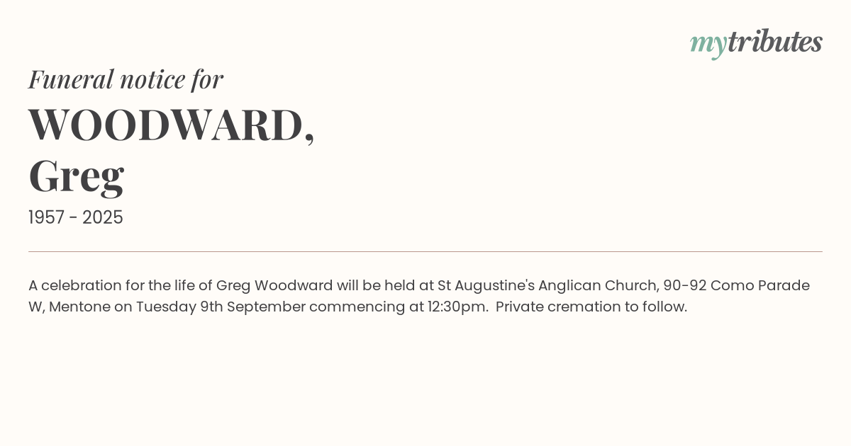 18°CA celebration for the life of Greg Woodward will be held at St Augustine's Anglican Church, 90-92 Como Parade W, Mentone on Tuesday 9th September commencing at 12:30pm. Private cremation to follow.