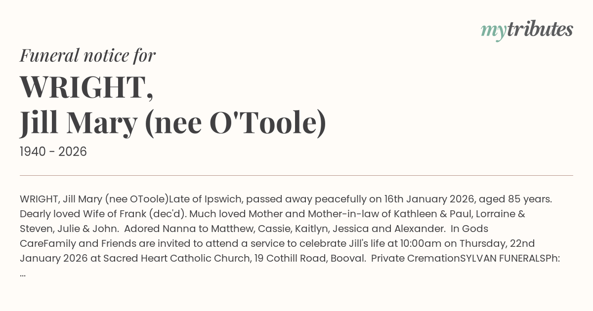 18°CWRIGHT, Jill Mary (nee O’Toole)
