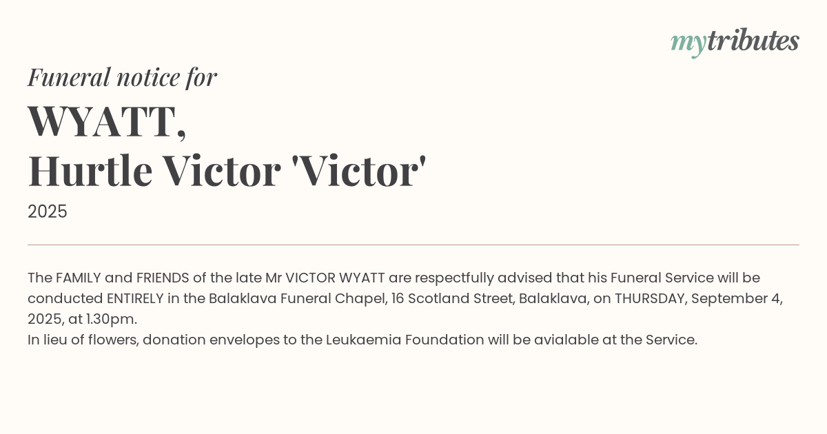 18°CThe FAMILY and FRIENDS of the late Mr VICTOR WYATT are respectfully advised that his Funeral Service will be conducted ENTIRELY in the Balaklava Funeral Chapel, 16 Scotland Street, Balaklava, on THURSDAY, September 4, 2025, at 1.30pm.