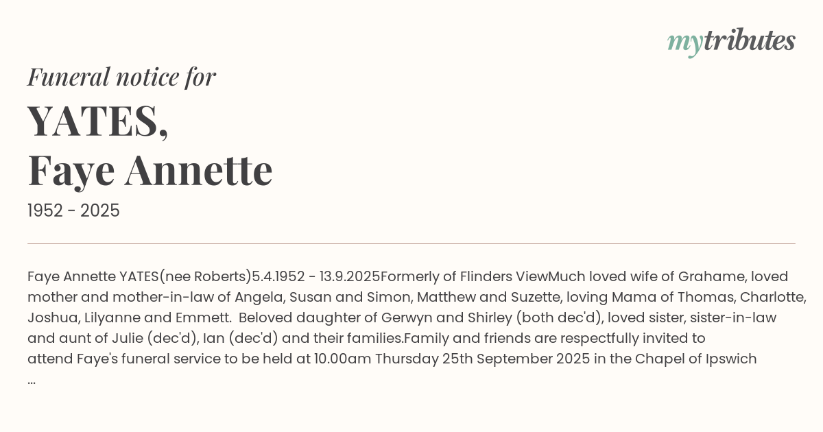 Family and friends are respectfully invited to attend Faye's funeral service to be held at 10.00am Thursday 25th September 2025 in the Chapel of Ipswich Crematorium at Warrill Park Lawn Cemetery, Anderson-Day Drive, Willowbank.
