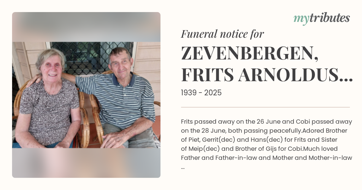 All Relatives and Friends are respectfully invited to attend the Funeral Service for Frits and Coby which appointed to commence at 10.30 a.m. on the 11th July 2025 at the Townsville Funerals and Cremations Chapel, 3 Railway Avenue, Railway Estate