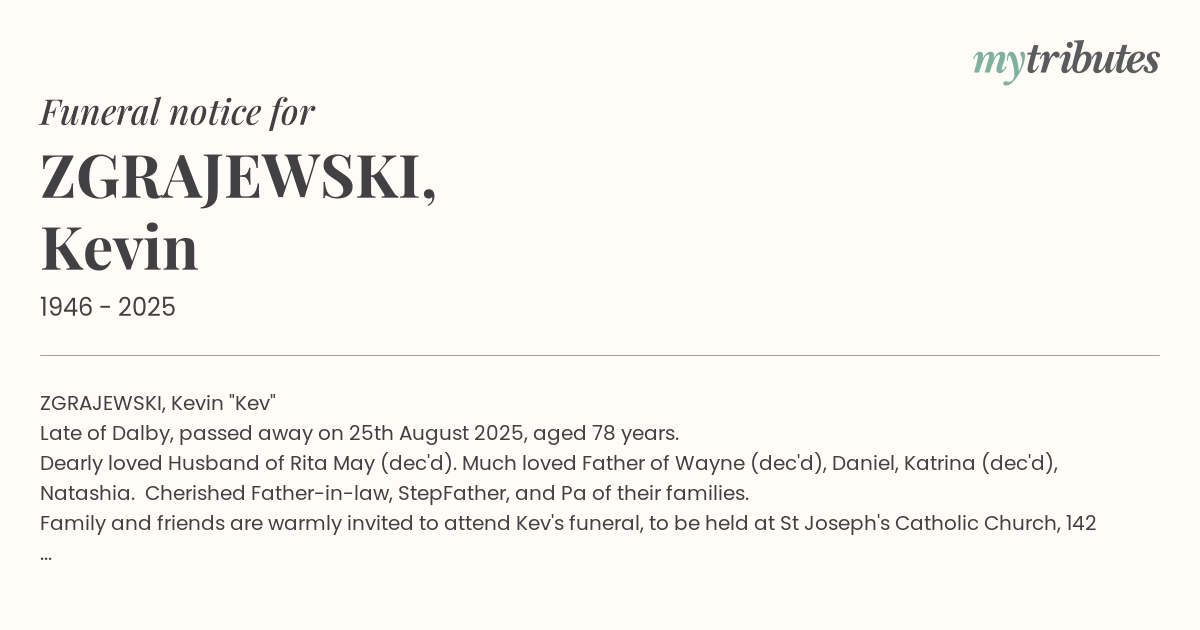 Family and friends are warmly invited to attend Kev's funeral, to be held at St Joseph's Catholic Church, 142 Cunningham Street, Dalby, service commencing at 11:00am, Friday, 5th September 2025, followed by interment at Myall Remembrance Park, Bunya Highway, Dalby.