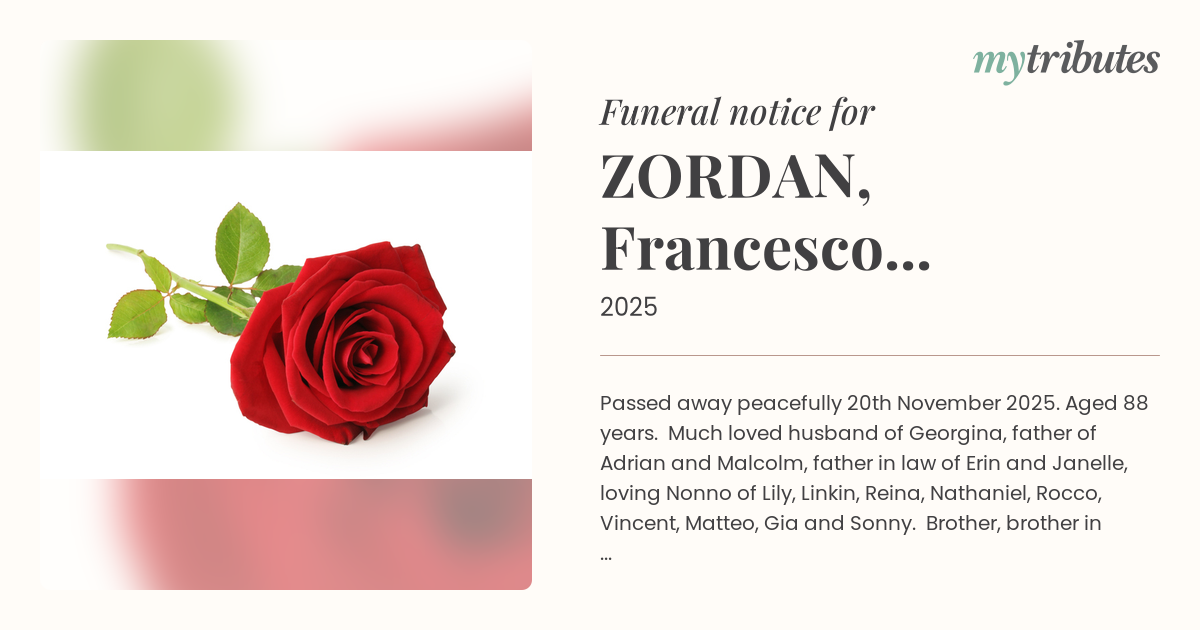 18°CPassed away peacefully 20th November 2025. Aged 88 years. Much loved husband of Georgina, father of Adrian and Malcolm, father in law of Erin and Janelle, loving Nonno of Lily, Linkin, Reina, Nathaniel, Rocco, Vincent, Matteo, Gia and Sonny. Brother, brother in law and zio.