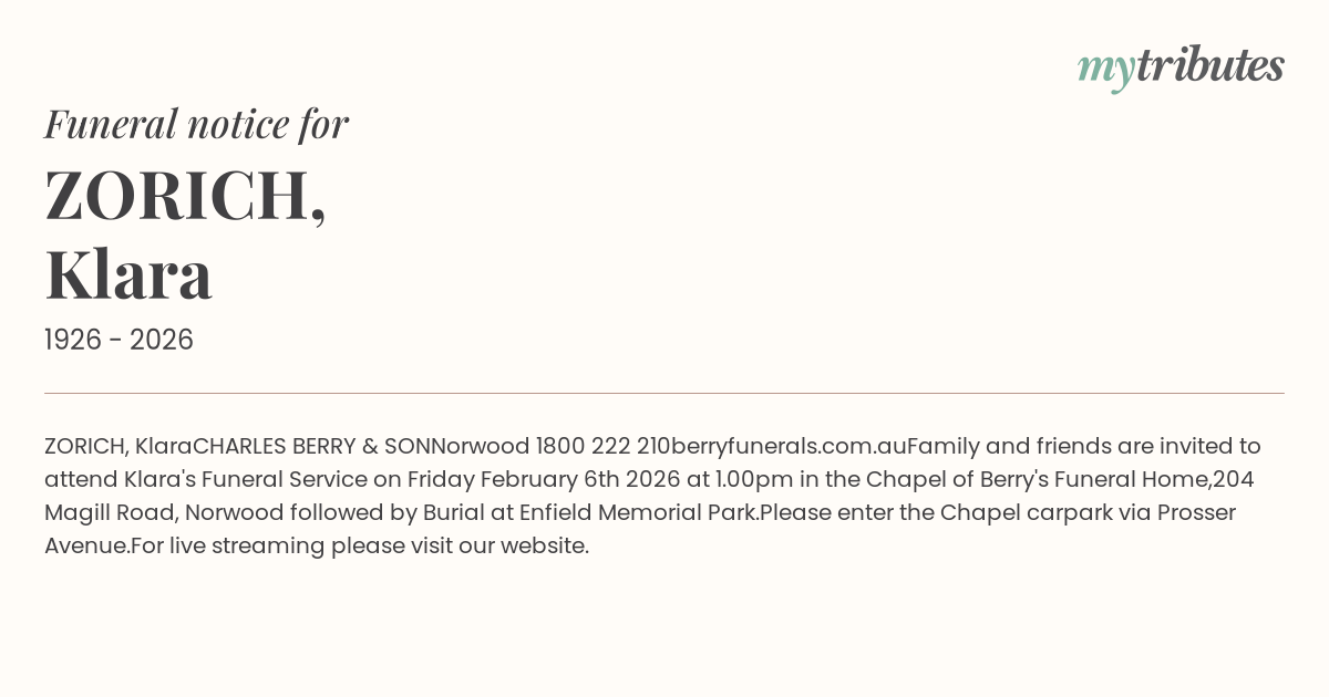Family and friends are invited to attend Klara's Funeral Service on Friday February 6th 2026 at 1.00pm in the Chapel of Berry's Funeral Home,